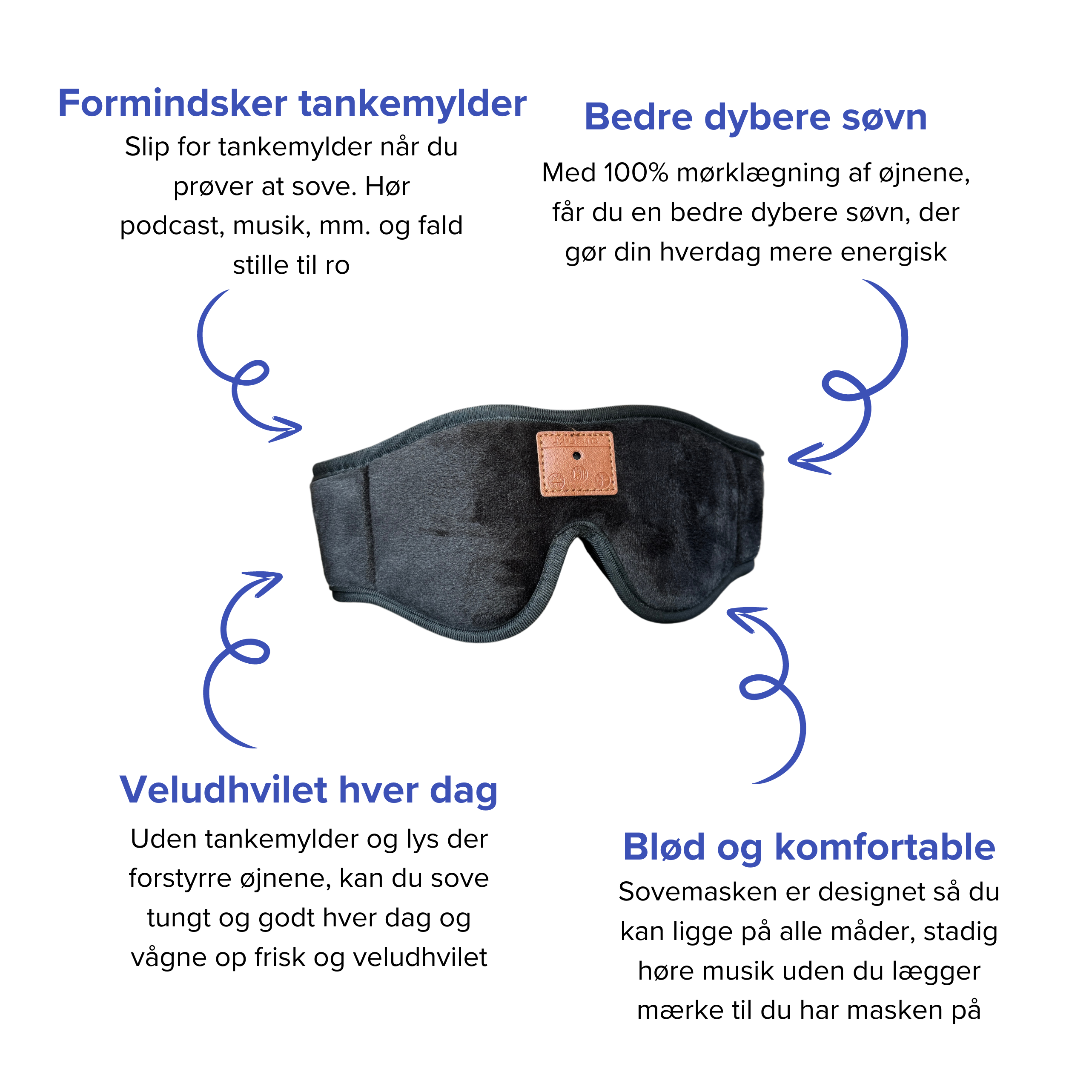 Deluxe Sovemasken fra NordicRest™ er ikke kun behagelig at have på, den forbedre også din søvn! Den totale mørke gør at du sovere dybere, mens muligheden for musik, podcast ell. kan gøre det nemmere at falde i søvn.